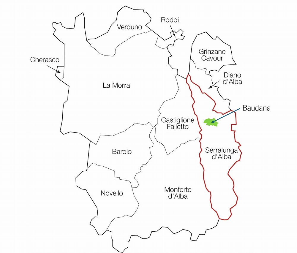 HP上の所有畑の位置から判断すると、今回のワインは、セッラルンガ・ダルバ村のバウナーダ(Baudana)というクリュ周辺のブドウによるもののようですが、インポーター(Firadis)の情報では南端のフランチャ(Francia)というクリュ周辺という情報もあり、どちらが正しいのかはわかりません。