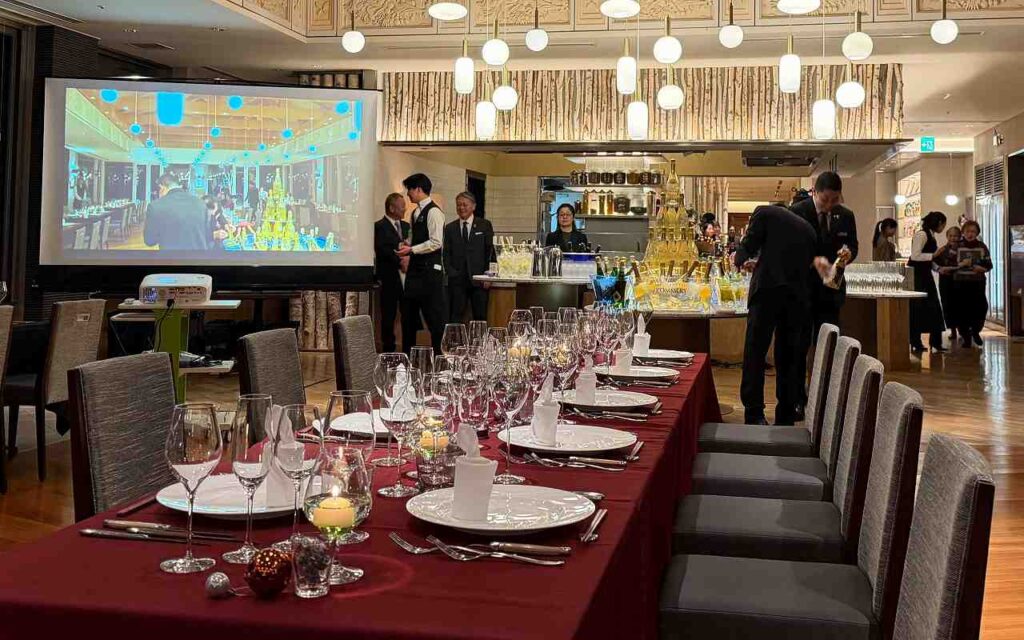 参加者60名のディナーイベントです。ヒルトンラグジュアリーLXRブランドホテル「ROKU KYOTO」の総料理長とのコラボレーションディナーとのこと。