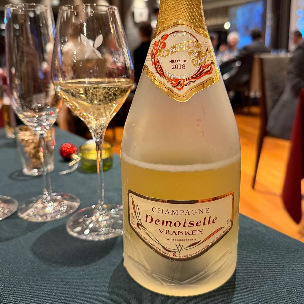 今回のイベントの目玉のひとつドゥモアゼル ラ パリジェンヌ ミレジムです。このシャンパンは1985年からリリースされているようですが、今回は、2018年ヴィンテージの日本初お披露目のようです。ドゥモアゼルとはフランス語で 「お嬢さん”」の他に 「トンボ」 という意味もあり、このブランドネームは、ランスのレ・ドゥモアゼル地区にあるカステーニュ城の庭園を飛びかうトンボに由来しているとのこと。冬らしいボトル。アールヌーヴォーを意識したデザインとのこと