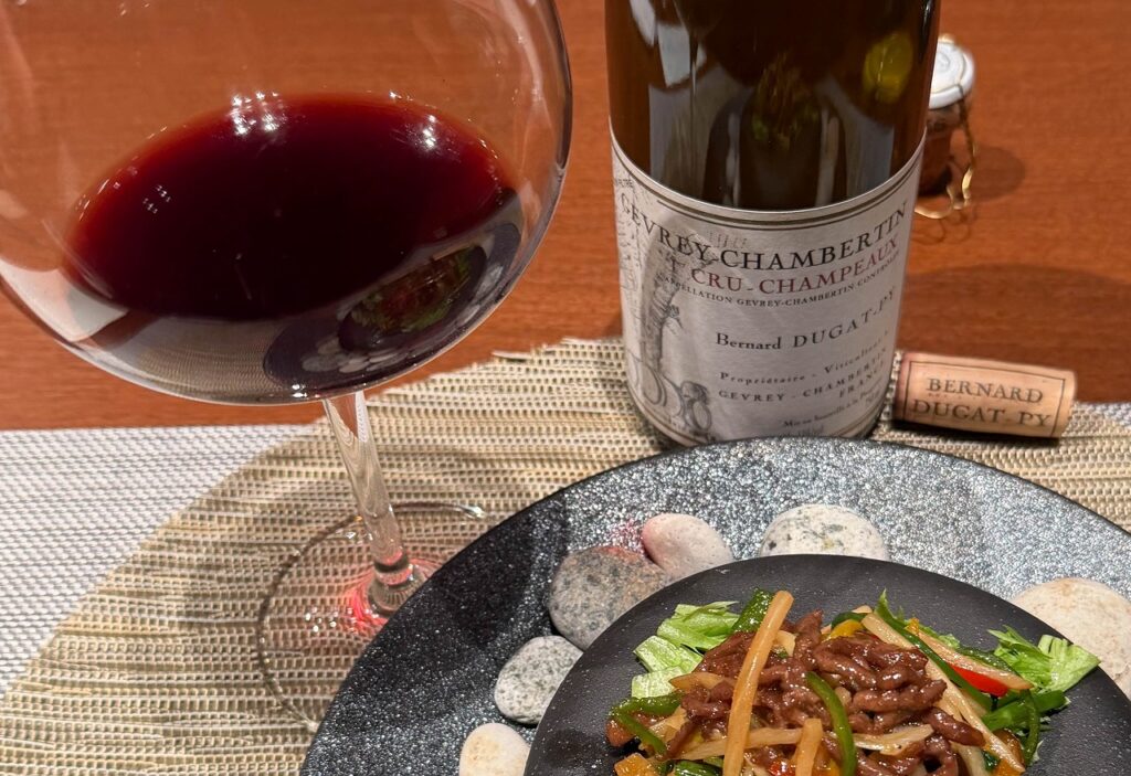 シャンパンは別として、中華にあわせるワインはいつも迷います。濃い味付けや辛味に繊細なブルゴーニュは、どうしてもワインが負けてしまう傾向があり、選択に躊躇してしまいます。今回は、抽出が強く、力強いブルゴーニュとしてデュガ・ピィをチョイスしました。ちなみに、過去は、アルド・コンテルノのバローロやガングロフのコンドリューと合わせました。