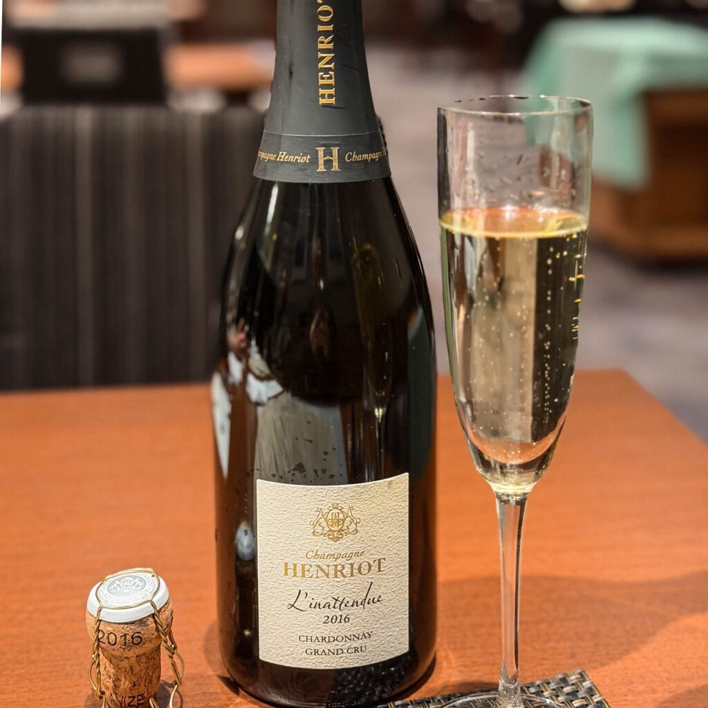 アンリオ(HENRIO)のスペシャル・キュヴェ L’Inattendue の2016年で、Inattendueは、「予期しない・思いがけない・意外な」という意味で、L’Inattendueは、「予想外の発見」「特別な区画」「驚きの味わい」を象徴しているようです。アンリオが所有・契約する畑の中からその年もっとも美しく表現された区画を選び、その単一区画のシャルドネだけで造るキュヴェで、アンリオ8代目当主が2015年に就任し、“区画ごとの個性をそのまま表現するシャンパーニュを作りたい”という新コンセプトを掲げたことがきっかけとなり、2016年に初めてリリースされています。現在は2018年も流通しているようです。