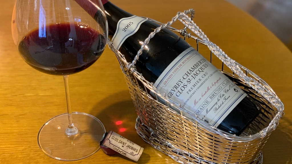 ドメーヌ・ブリューノ・クレールのジュヴレ・シャンベルタン・1erCru・クロ・サン=ジャックです。ブルゴーニュのプルミエ・クリュとしては最もしっかりした骨格を持つといわれるこの畑の2005年ヴィンテージ、少し早いかなと思いつつも抜栓してみました。