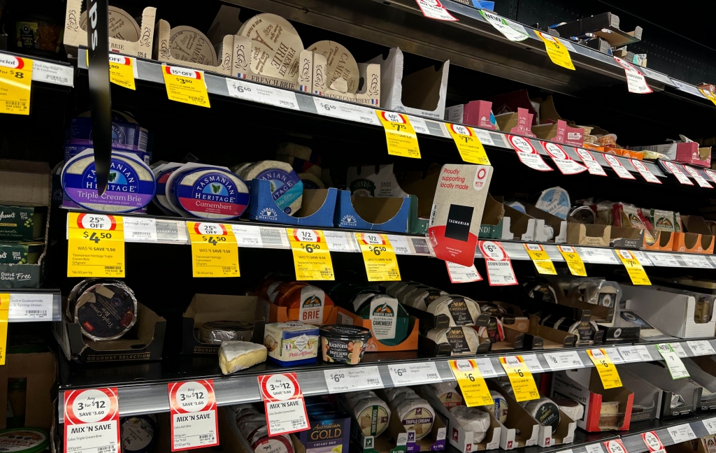 海外のスーパで必ずチェックするチーズ売り場です。ヨーロッパやアメリカ同様にかなりの種類のチーズが並んでいます。切り売りもありますが、こちらは、工場製のチーズ売り場です。EmborgやCastelloなど、日本にスーパでも見かけるインターナショナルブランドのチーズが並んでいますが、左側にあるタスマニア産チーズに目が行きました。地元産のカマンベールタイプを購入しました。250gで6.5$(約650円)ですから、日本での同種のチーズの半額程度です。