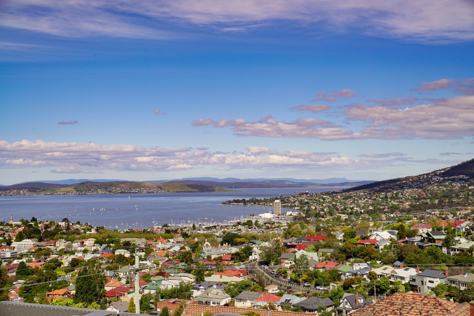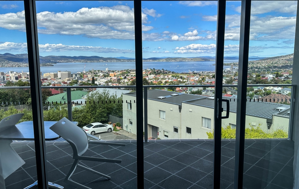 フロントの女性の対応も非常にフレンドリーですが、何よりもここからの眺望がすばらしい。テラスからは、ホバートの町が一望できます。
