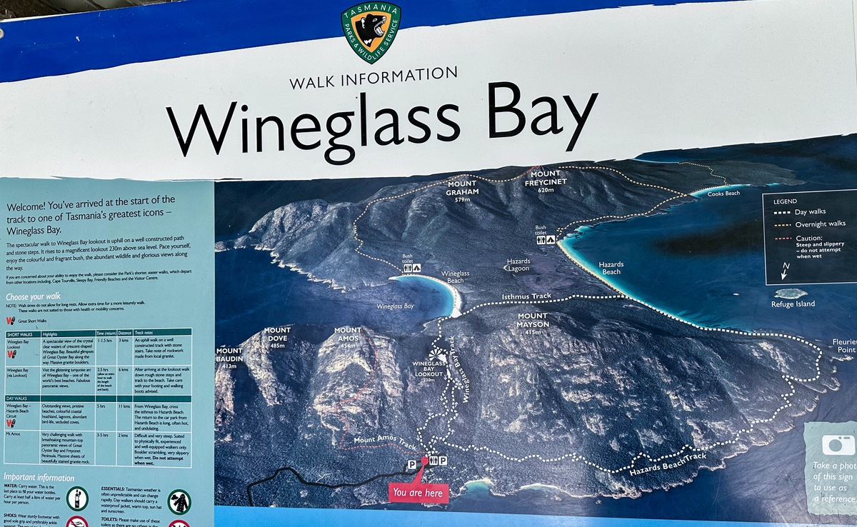 展望台(Wineglass Bay Lookout)までは3km、徒歩で1時間半、海岸までは6km、徒歩2.5時間とあります。
