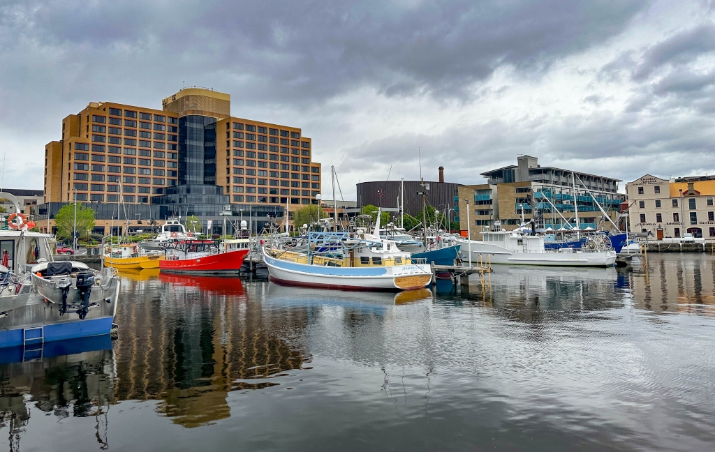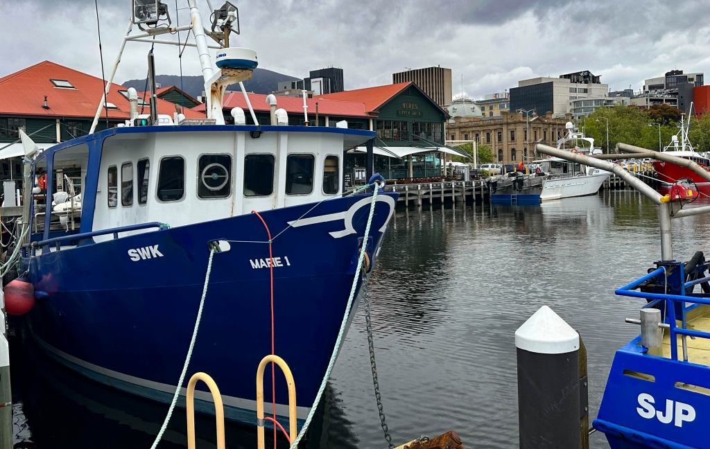 朝は、あいにく悪天候で時折雨がぱらつく中、ホバート港周辺の散策を楽しみました。漁船、帆船、クルーザ等の様々な船が停泊しする港を囲うようにレンガ造りの建物とモダンな建築が混在する街並みです。