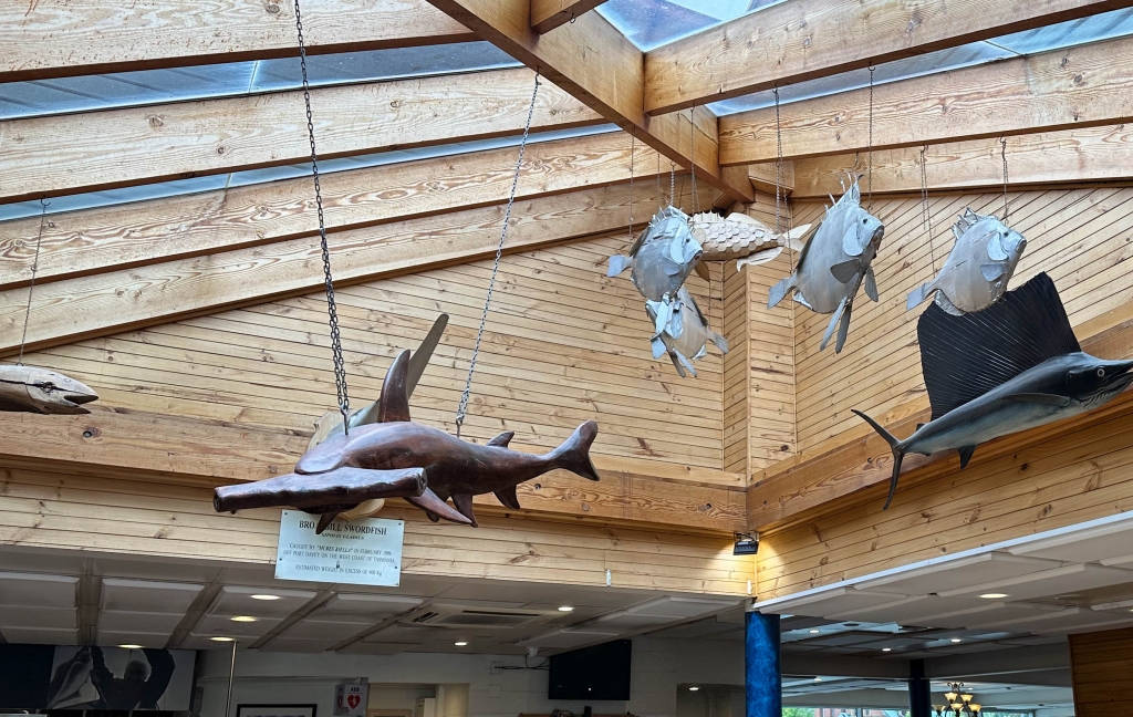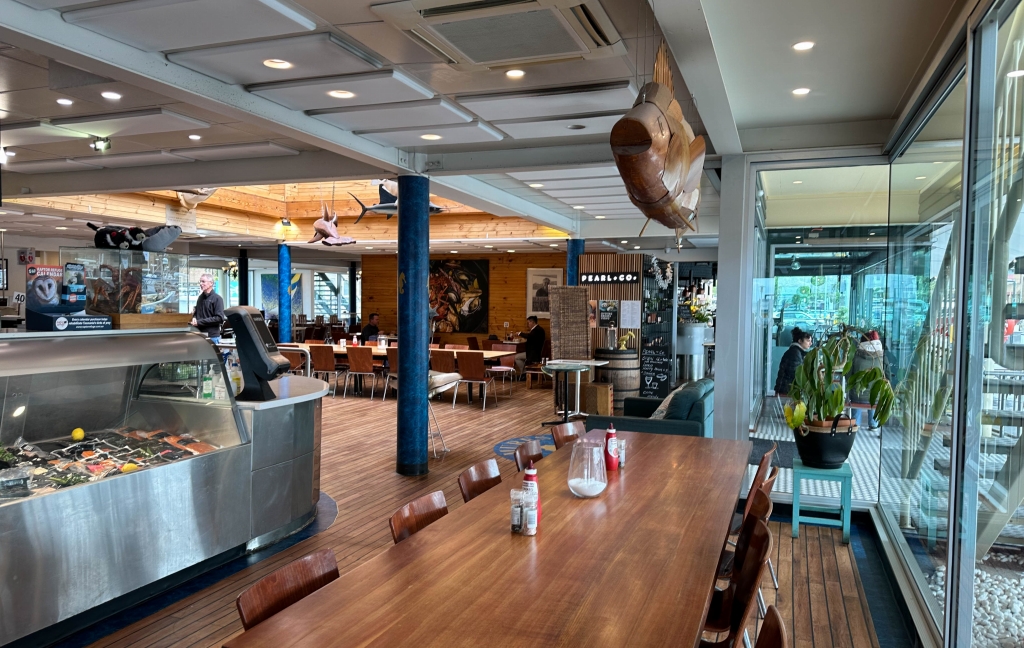 非常にモダンな店内で、魚をモチーフにした洒落たオブジェが目に留まります。