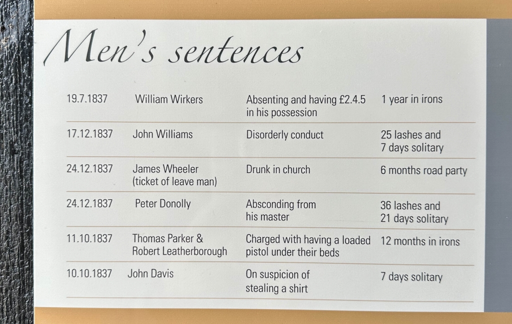 収監理由は、教会での飲酒、雇い主からの逃亡、シャツ1枚の窃盗とか、これだけ見ると、ポートアーサのような重罪犯ではなく、比較的軽い刑罰の囚人が投獄されていたように見えます。刑罰は、雇い主からの逃亡に対して、36回の鞭打ちと21日の独居房とか罪の割には、比較的重く見えます。