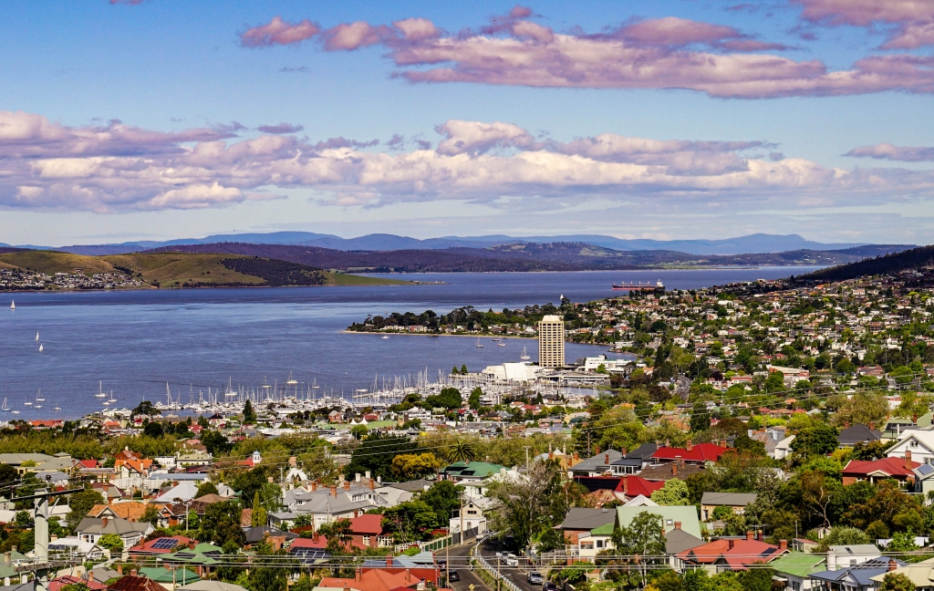 ↓郊外の高台に立つホテルから見降ろすホバート港周辺の街並みです。