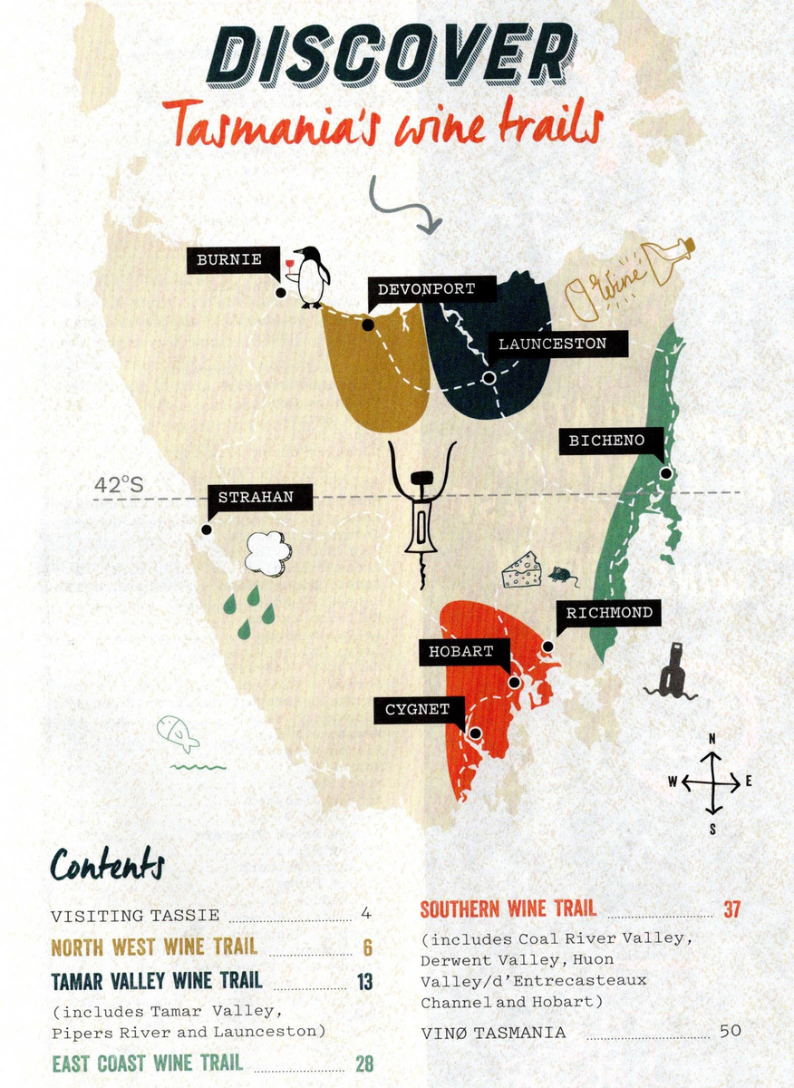 North West Wine Trailでは、4つのワイナリー、北部の代表都市ローンセストンに近いTamer Valley Wine Trailには、19のワイナリ、東海岸のEast Coast Wine Trailには11のワイナリー、そしてホバート周辺をやリッチモンドを含むSouthern Wine Trailには、16のワイナリーが紹介されています。