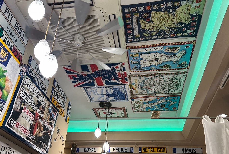 店内はこんな感じです。壁や天井ににヨーロッパのカスタムナンバープレートやコットンマップ等々、目を楽しませてくれる派手なデコレーションです。