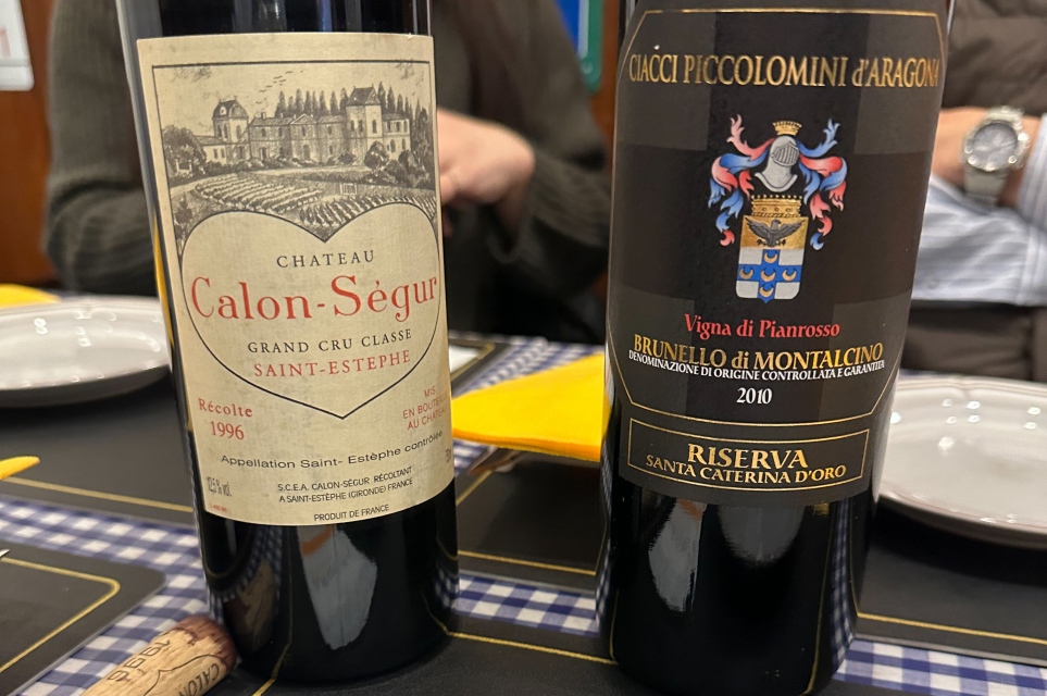 ↓カロン・セギュールの1996年にブルネッロ・ディ・モンタルチーノの2010年、あと写真には写っていませんが、ローヌのシャトー・ヌフ・デ・パブ(ドメーヌ・サン・プレフェール 2016年)の3本を持ち込みました。