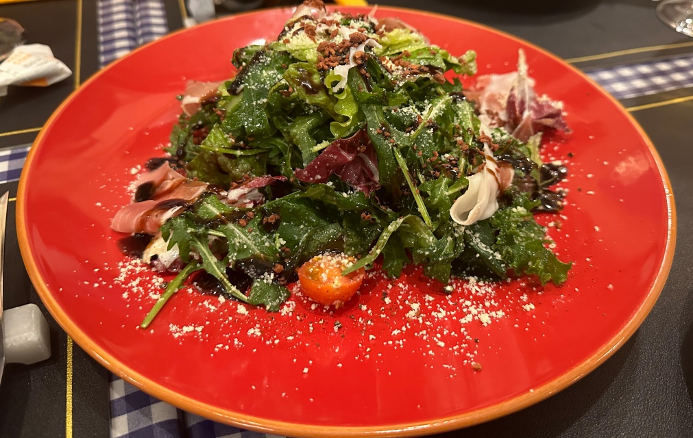 ↓ルッコラと生ハムのサラダ。パルメザンチーズにバルサミコ酢がかかっています。