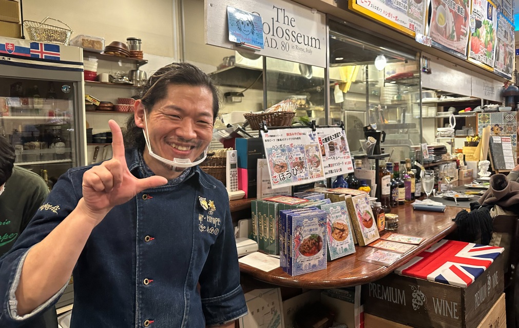 後ろに映っているのは、お土産のレトルト商品です。ビーフストロガノフ、ハンガリー式ビーフシチュー、欧州カレー。特にビーフシチューがお奨めです。