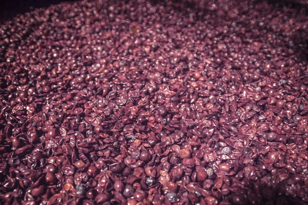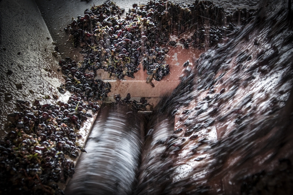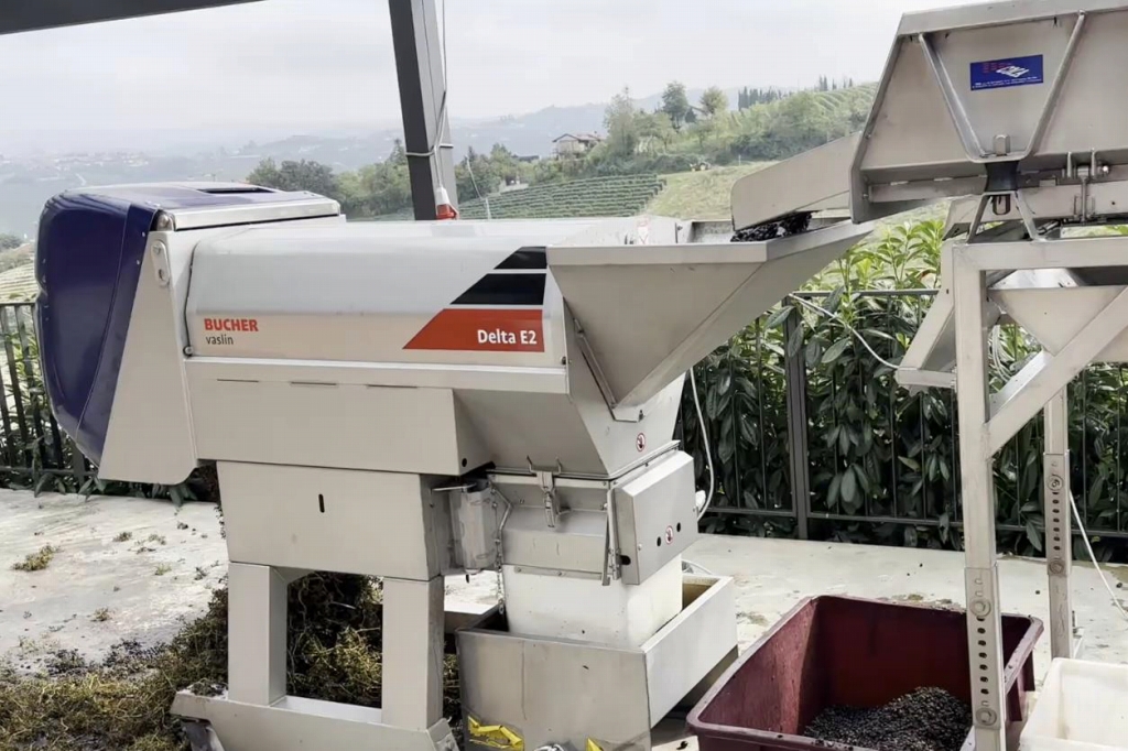 この1週間は、ドルチェットの収穫を行っていたようで、アルコール発酵の匂いが漂っていました。ドルチェットは、上の機械で100%除梗し、実・ジュースと皮・種の状態で1週間発酵させ、その後皮とジュースを分けて、別のステンレスタンクに移して、更に1週間発酵(温度は26℃に保つ)させたのちに、マロラクティック発酵(MFL)を行い、ステンレスタンンで熟成させます。圧搾は、まずソフトプレスを行い、そこで得られたジュースのみがここのワインに使われ、2回目に荒くプレスしたものは、使わずに売ってしまうようです。ドルチェットの生産量は3万本とのこと。