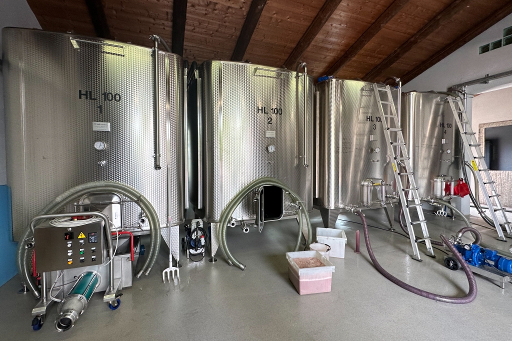 収穫されたブドウは、直ぐに除梗機にとおされ、茎が取り除かれ、そのままステンレスタンクに流し込まれています。この除梗機自体は、何度も目にしていますが、実際に稼働している光景は初めて見ました。