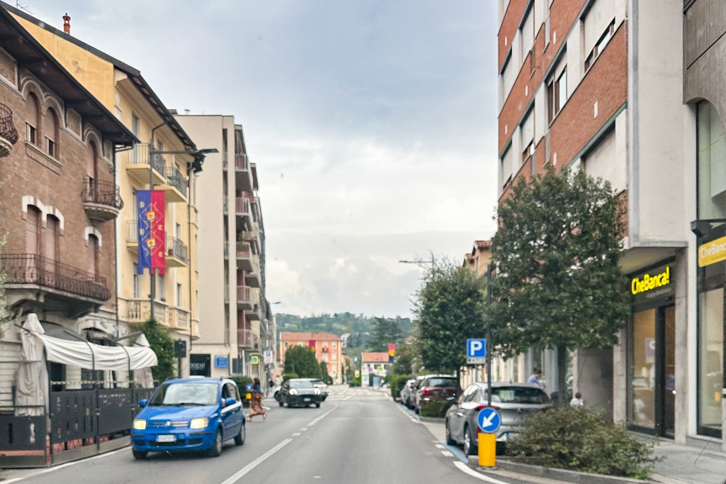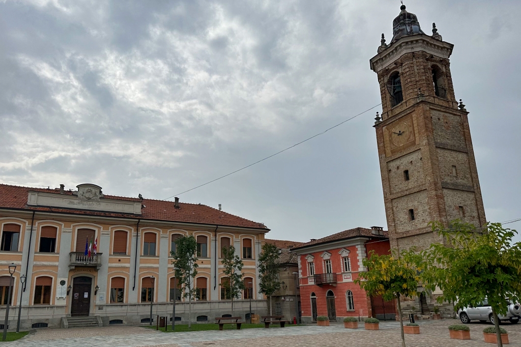 ↓この日3軒目のワイナリーであるマウロ・ヴェリオがあるラ・モッラ(La Morra)村の中心部です。ラ・モッラは、バローロ地区の中で栽培面積が最も多い村になります。あいにくの空模様です。