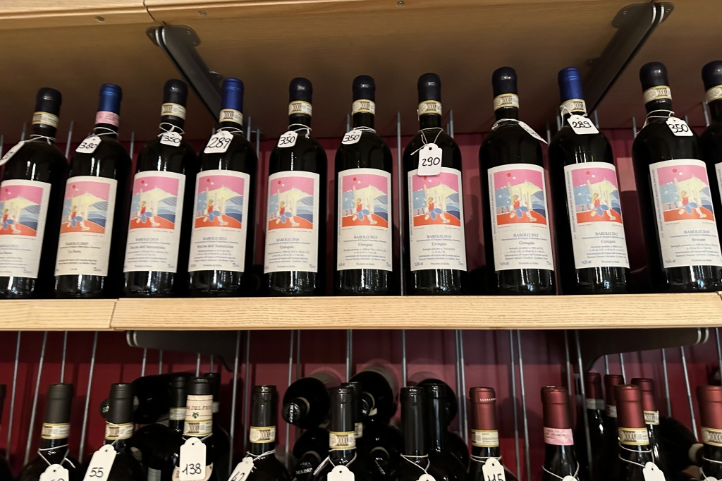 ↓こちらは、村の中にあるVicino DiVinoというワインショップです。外側からは分かりにくいですが、結構大きな店舗で、バローロの凄い品揃えです。