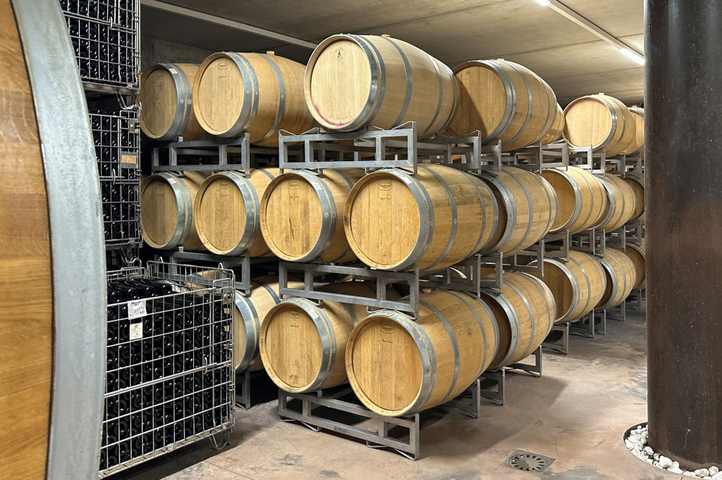 ↓樽と瓶熟中のワイン、そして出荷待ちのワインが同じ場所に同居しています。