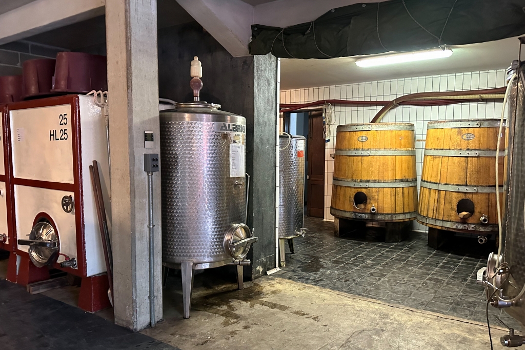 ↓発酵用の木樽、ステンレスタンク、コンクリートタンクが並んでいます。