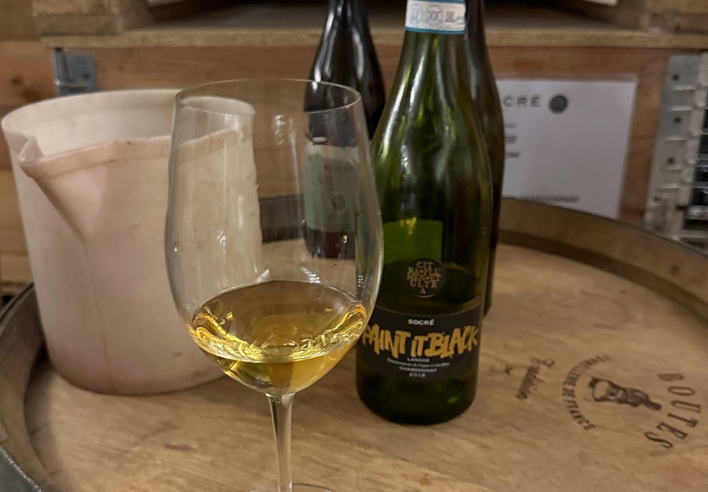 続いての試飲は白です。2018年のランゲ・シャルドネでバリックで熟成させているとのこと。”PAINT IT BLACK”という銘柄です。知らなかったのですが、ローリングストーンの曲名のようです。白ワインですが、赤ワインのように造ったとのこと。皮と共に醸して仕込んでいるワインと思われます。それを反映して、やや濃い黄金色です。