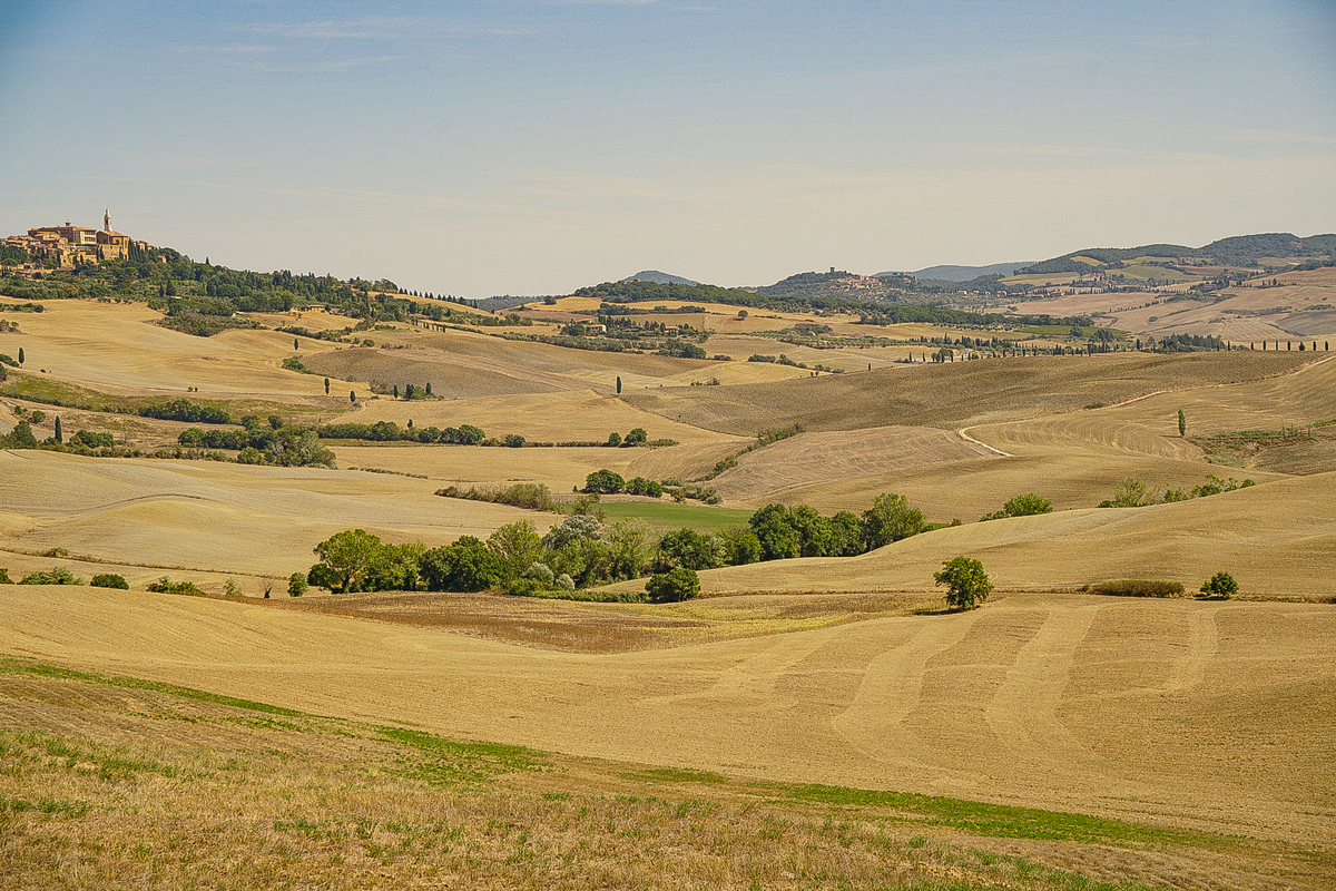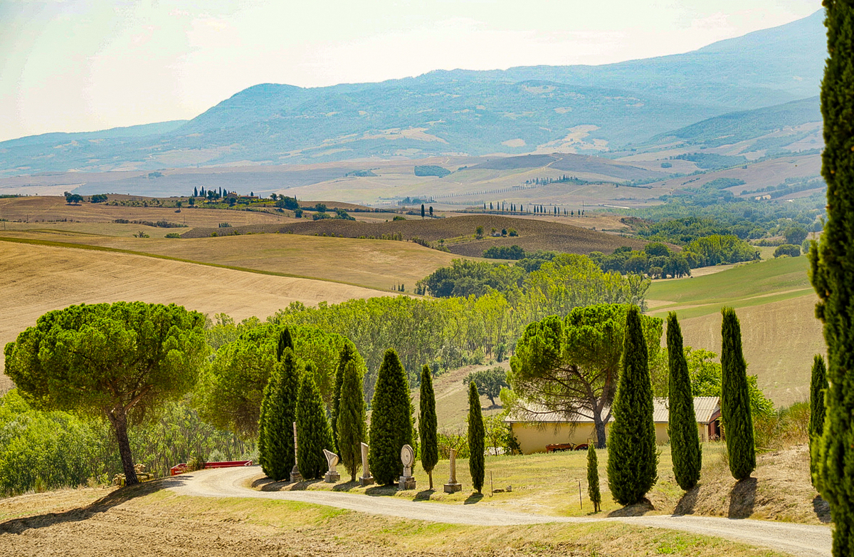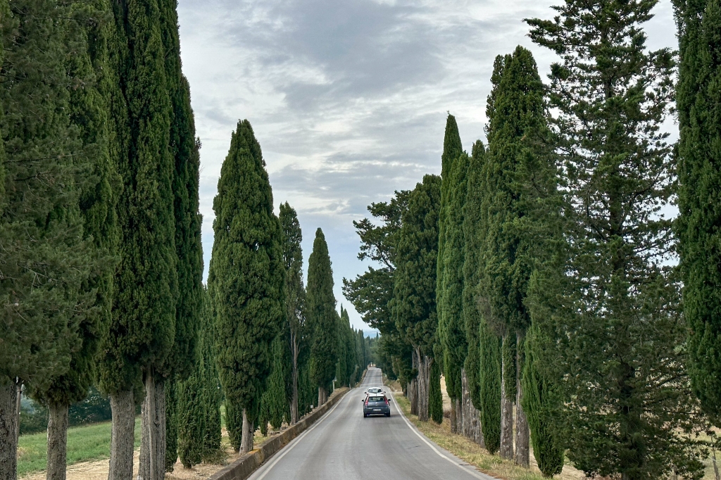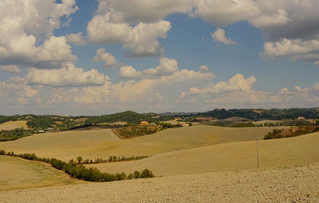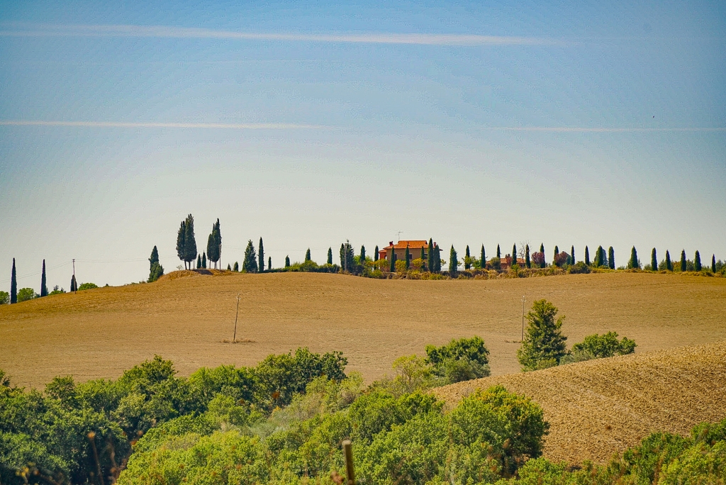 4日目は、Casanova/Selvatelleから思い切って足を延ばして、車で2時間かけて、トスカーナ南部のオルチャ渓谷を訪れました。なだらかに連なる丘、立ち並ぶ糸杉、パッチワークのようなオリーブ畑やブドウ畑が広がるこの地は、2004年に世界文化遺産に登録されています。