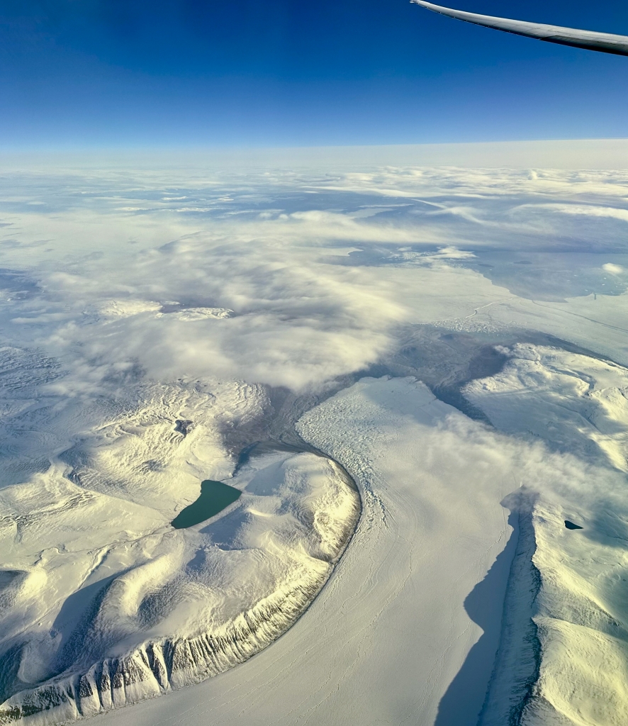 ↓こんなハート形の湖も見えます。一面真っ白な北極海の光景と思ったのですが、ところどころ雲で隠れながらも意外に楽しめました。