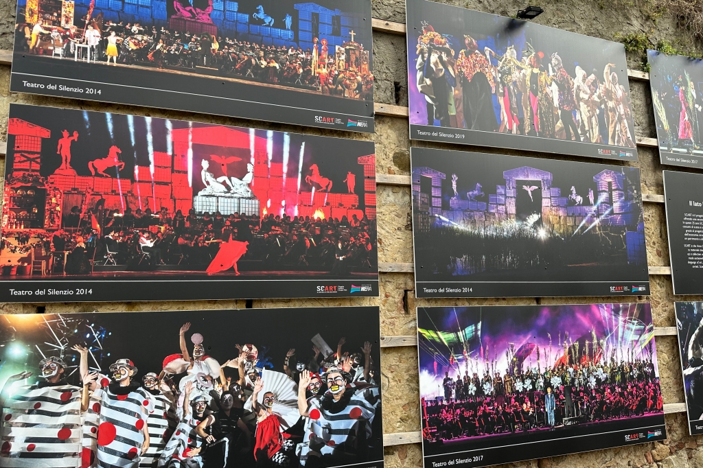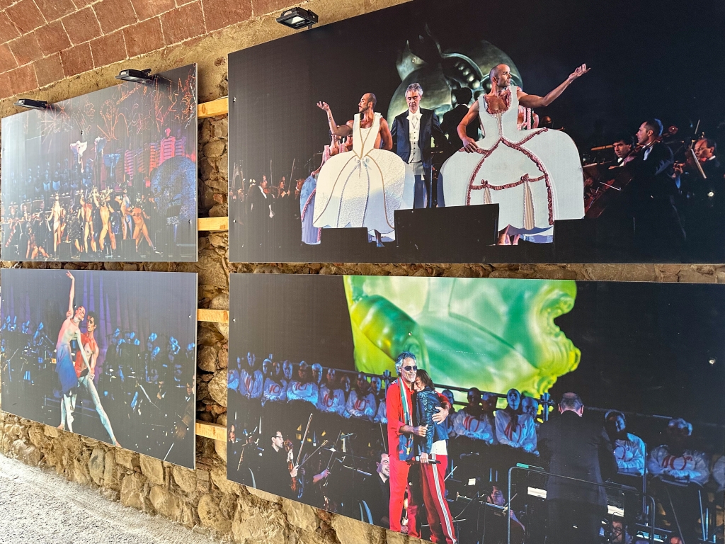 ↓街中色々なところで、アンドレア・ポチェッリの出演したオペラの公演模様の写真が見られます。