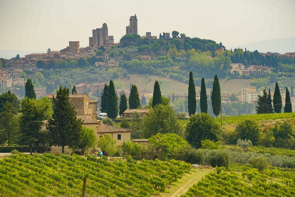 標高324mの丘の上にあり、中世には多くの塔が造られたことから「塔の街」と呼ばれる要塞都市です。10世紀以降北方民族の侵入からモデナの聖人ジミニャーノが町を守ったということから聖ジミニャーノ=サンジミニャーノと呼ばれるようになったと言われます。1990年に世界遺産に登録されています。