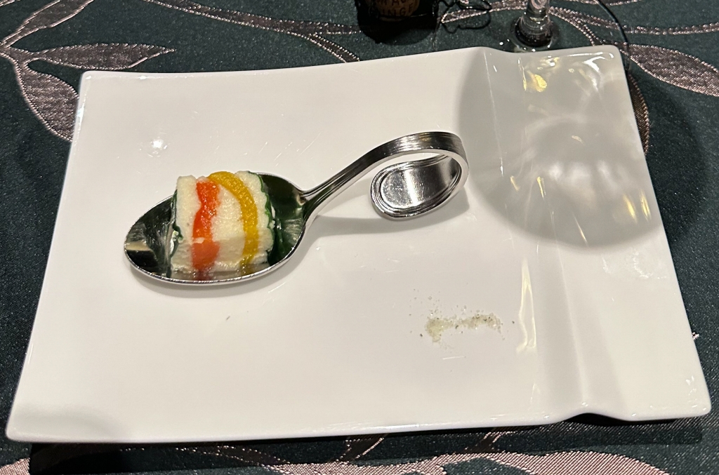 ↓コースの最初は、マスカルポーネチーズに野菜のジュレをサンドしたカラフルなアミューズから。