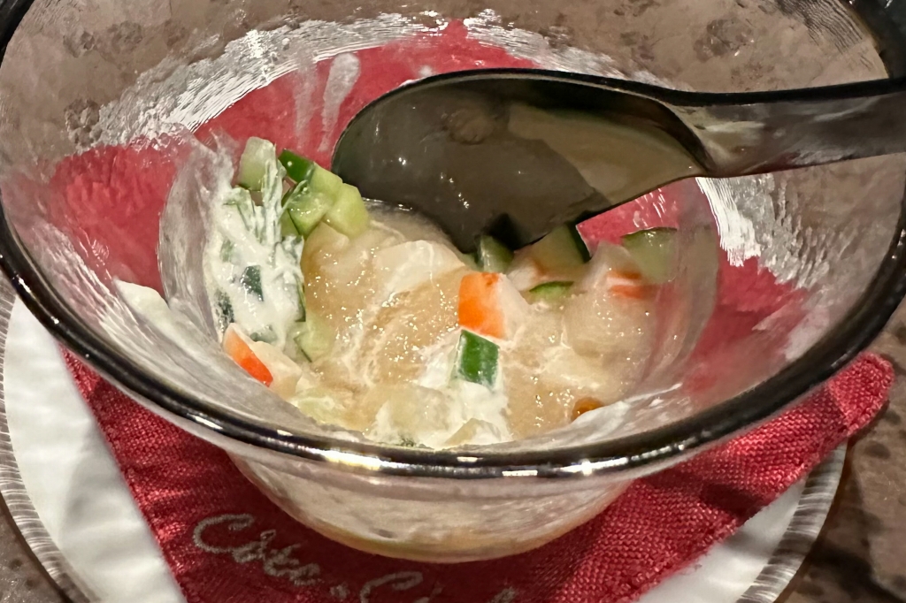 ↓オードブル一皿目 エビ梨と海老のパルフェ
