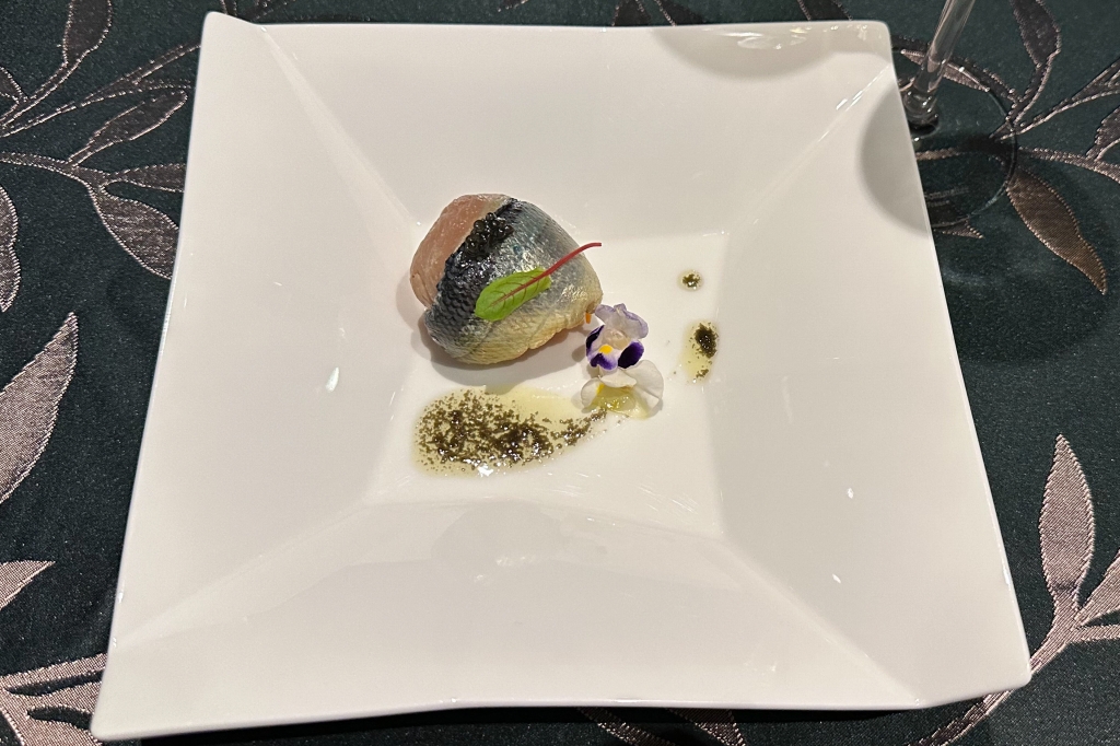 ↓オードブル二皿目 サヨリの燻製 根野菜のラペ キャビアのピューレ 。これはシャンパンと最高の相性でした。