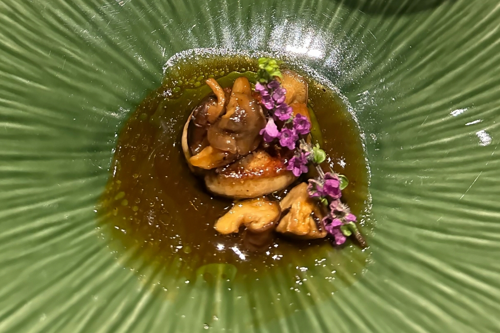 ↓オードブル三皿目は、フォアグラのソテー 茸のマリネ。フォンドボーのソースが絶妙です。このソースのおかげもあり、赤ワインとの相性はばっちりでした。
