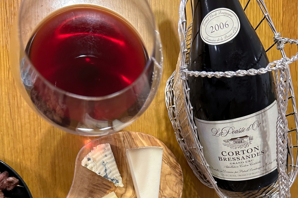 ヴォルネイに本拠を置くドメーヌ・プス・ドールのグラン・クリュ、コルトン・ブレッサンドです。ヴィンテージは、2006年。冷涼でやや難しい年ですが、骨格のあるクラシカルな印象のブルゴーニュワインでした。4種のチーズと家飲み定番の焼き鳥と合わせて、愉しみました。