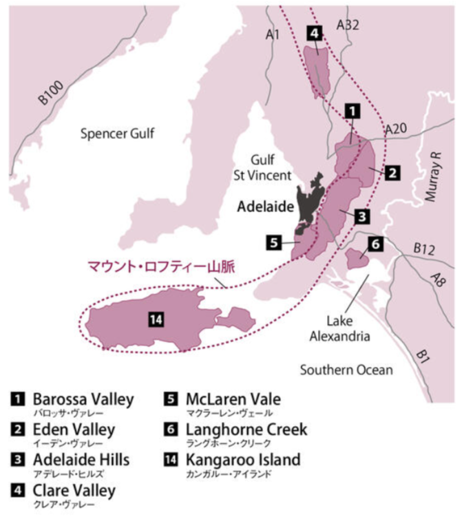 このアデレードを中心とする産地ですが、その地形から、同じ品種でも異なる特徴のワインを産出することで知られています。ポイントは標高ににあります。上記地図のマウント・ロフティ山脈(Mount Rofty Ranges)に位置する標高350m~900mには、アデレード・ヒルズ、クレア・ヴァレー、イーデン・ヴァレーがあり、バロッサ・ヴァレーやマクラーレン・ヴェールやバロッサ・ヴァレーは、標高が比較的低い産地になります。この標高差が、産出するワインの特徴の違いになっており、前者は、冷涼な気候により、エレガントなワイン、後者は、濃厚で力強いワインを生み出します。