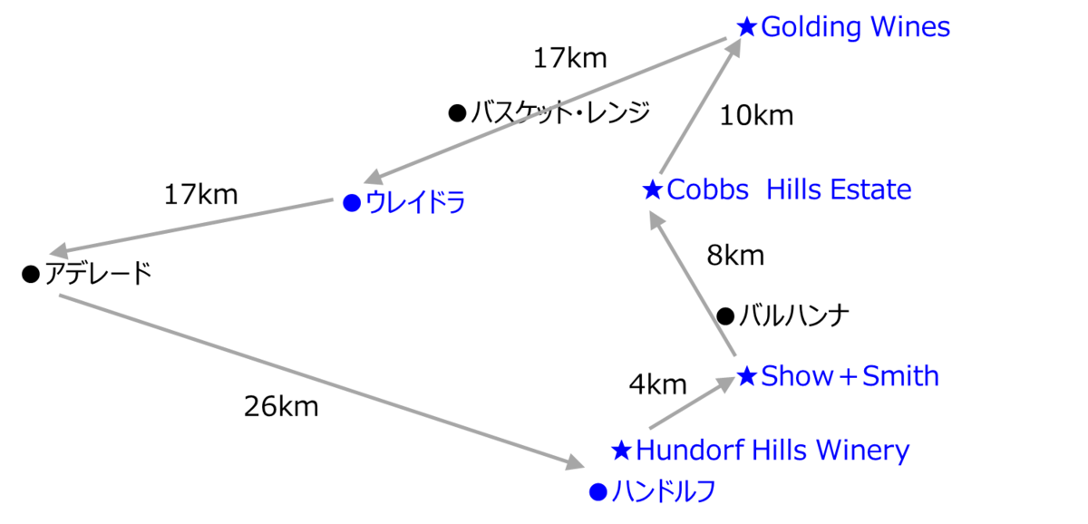 ↓こんなコースで回りました(数字は車でのおおよその距離になります)。アデレード市内から丸一日で無理なく廻れるれるコースなので、お奨めです!