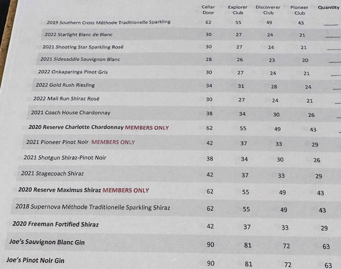 ↓価格表です。スタンダードラインで30豪ドル程度と割合と手頃です。先述のメンバー価格が併記されており、メンバーでないと買えないワインもあるようです。
