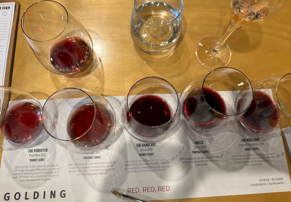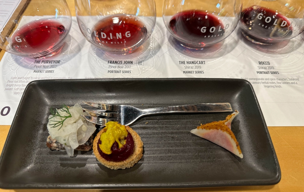 今回は、赤ワイン5種の”Red,Red,Red”というコースを選び、ピノノワール2種(2017&2022年)、シラーズ2種とカベルネ・ソーヴィニヨンのテースティングを行いました。2022年のピノは、流石に若々しく、2017年は少しレンガ色が入っていますが、いずれも明るい色調で、熱量の低い、如何にもクール・クライメイトな産地を感じさせます。前滞在地で飲んでいたタスマニアのピノは、どちらかといえば、甘さを感じるニューワールド的なワインでしたが、それとは全く違います。タスマニアの方が緯度的には南(北半球で言えば北)なので、冷涼なイメージを抱きますが、やはり産地の標高でしょうか?もっともタスマニアのワインも飲んだのは2本だけなので、一概には判断できないと思いますが…。シラーズもやはりエレガントさを感じさせるワインでした。