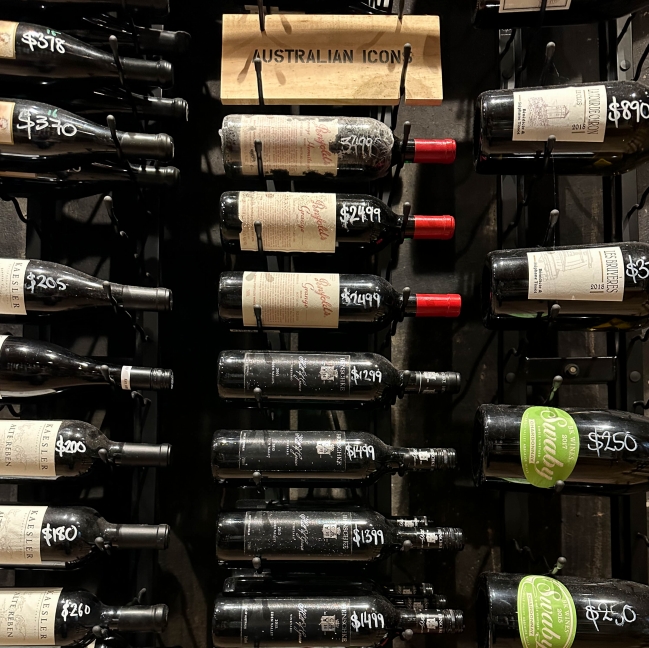 AUSTRALIAN ICONSのところには、ペンフォールドのグランジやヘンチキのヒル・オブ・グレースといったプレミアムワインが並んでいます。瓶に価格が書かれており、1986年のグランジが3499$、1990年と2004年のグランジは2499$!です。