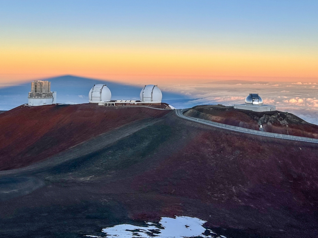↓マウナケアの山頂には、各国の天体観測所が並んでいます。左端の少し角ばった望遠鏡が、日本のすばる望遠鏡です。