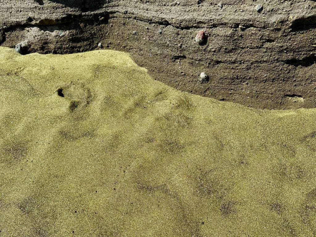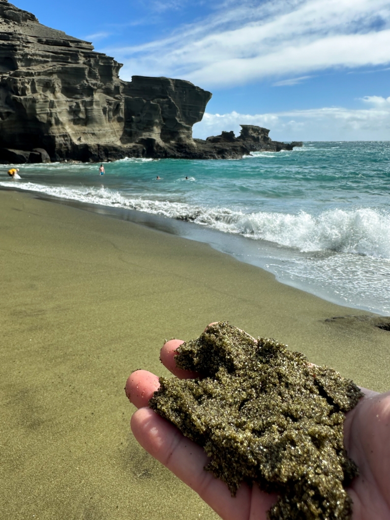 グリーンサンド(緑砂)名前ですが、カンラン石という緑色の鉱物が たくさん混ざっていることで、砂がこのように見えるようです。確かに、手に取ると黒い砂に混じって、きらきらとした緑色に輝く粒が混ざっています。