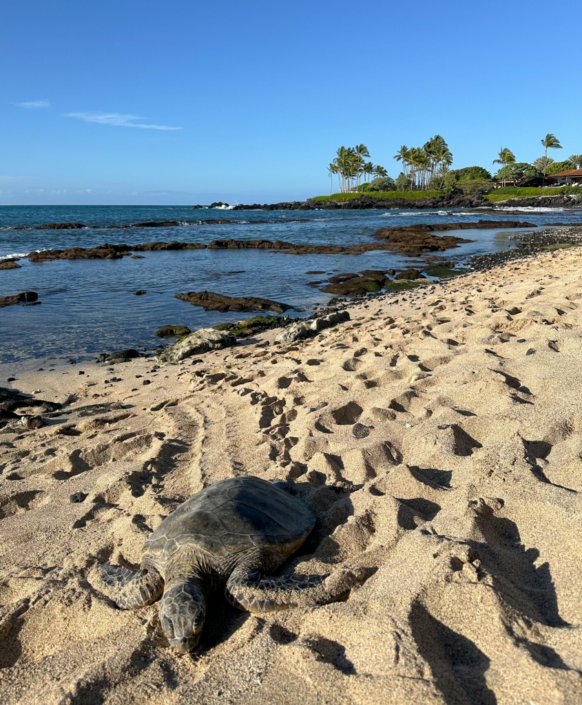 ↓コナ空港とワイコロアのほぼ中間にあるフォーシーズンリゾート近くにあるパブリックビーチ、Kuki’o Beachです。ウミガメが、甲羅干しをしています。ハワイ島の南にあるプアヌル・ブラックサンドビーチが甲羅干ししているウミガメが良く見られる名所として知られていますが、リゾートに近いこんな場所でも見られるようです。
