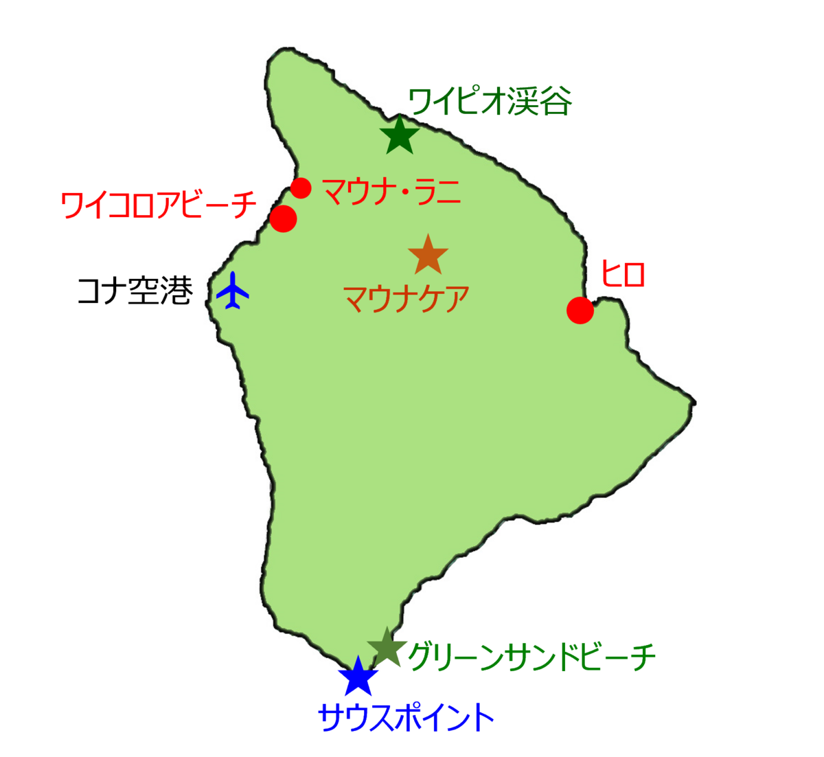 今回訪れた主な観光地は、マウナラニ、マウナケア、ワイピオ渓谷、グリーンサンドビーチ、サウスポイントです。