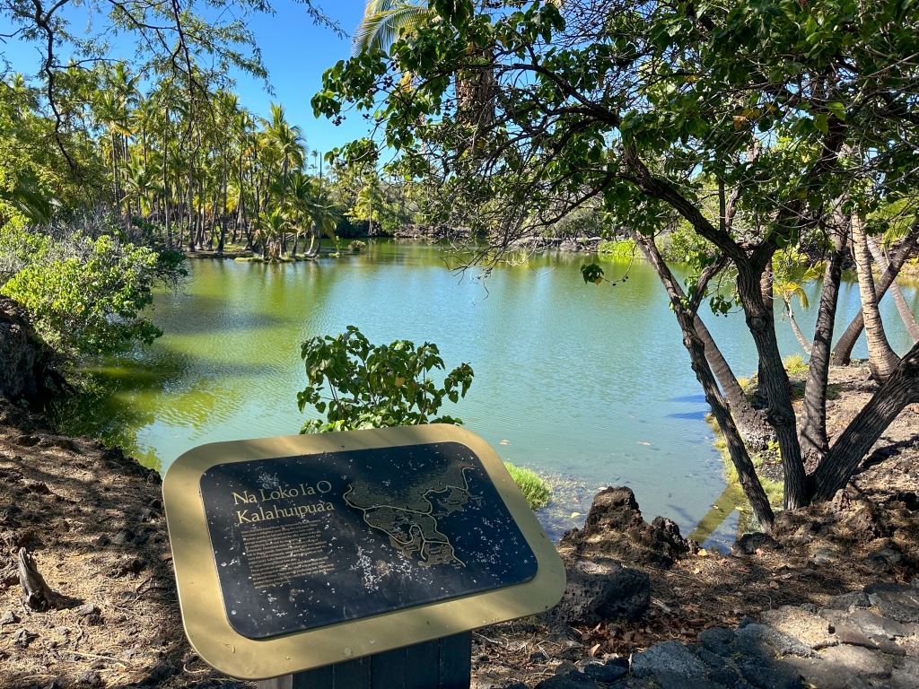 ↓こちらは、滞在地のワイコロアビーチから、北に車で10分くらいのところにあるマウナラニ・リゾートの敷地内にある史跡、ワイプヒ・フィッシュポンド (Waipui Fishpond) です。王族に献上するための魚を養殖していた神聖な池として知られています。
