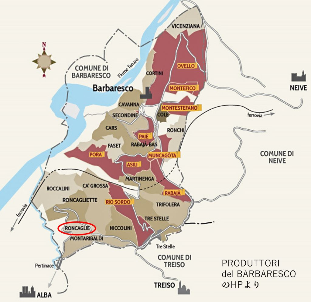 ロンカリエ(Roncaglie)はバルバレスコ村のクリュのひとつですが、正直、バルバレスコのクリュについては、あまり詳しくないのでピンときませんでした。後から調べてみると、銘醸畑のアジリ(Asili)やリオ・ソルド(Rio Sordo)に劣らない素晴らしいテロワールを有する畑のようです。
