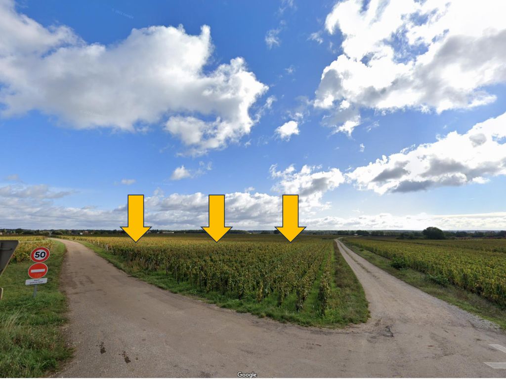 ↓Googleのストリートビューで見るとこのあたりかと思われます。コート・ドールを訪れたことがある方はご存じかと思いますが、国道の東側は、延々と平坦なブドウ畑が続いています。