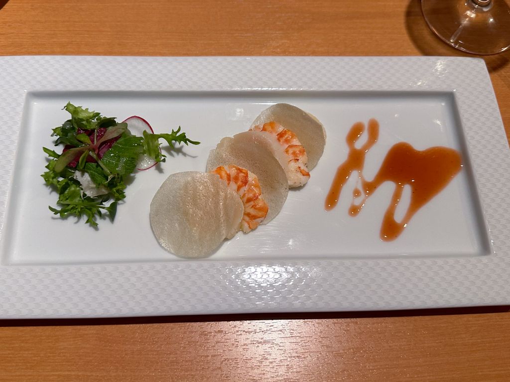 このシャンパンは、前菜の「アスパラガスのブッラータチーズのソース」(写真なし)と「ホタテ貝と海老のミルフィーユ仕立て」と合わせました。