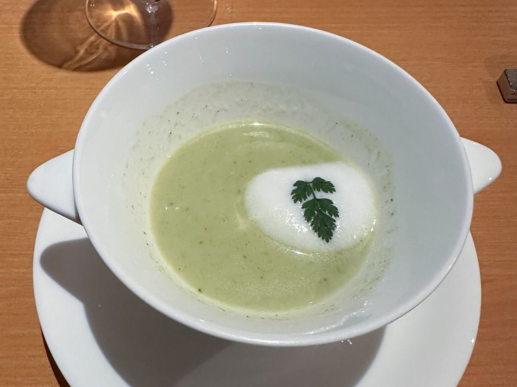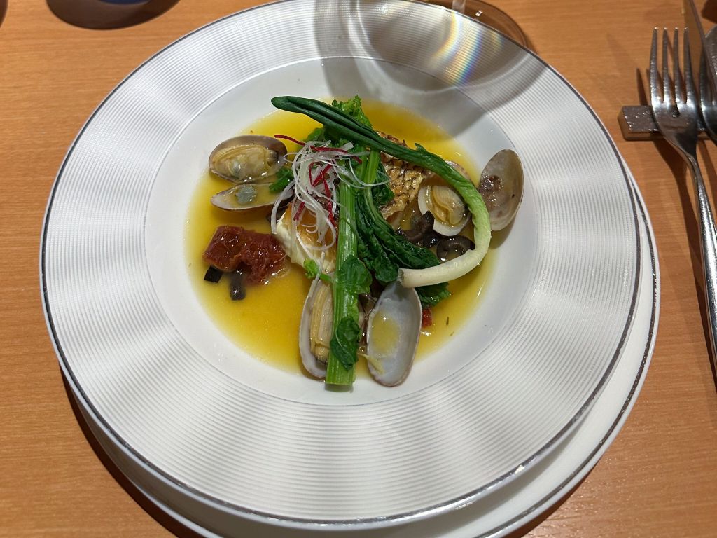 ブロッコリーのスープを挟んで、魚料理は「真鯛と浅蜊のマルセーユ風蒸し煮」です。