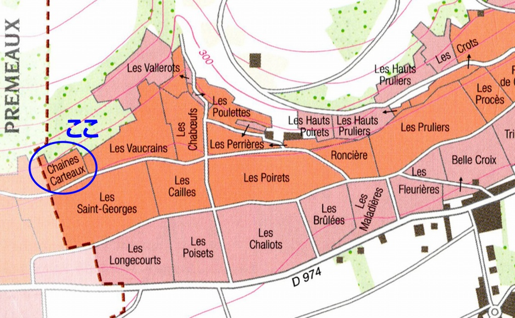 聞きなれない畑ですが、ヴォルネイの北東端、ポマールと接し、ミシェル・ラファルジュで有名なレ・ミタンの隣の畑のようです。ラックの資料だとドメーヌの所有は僅か0.37haとのこと。