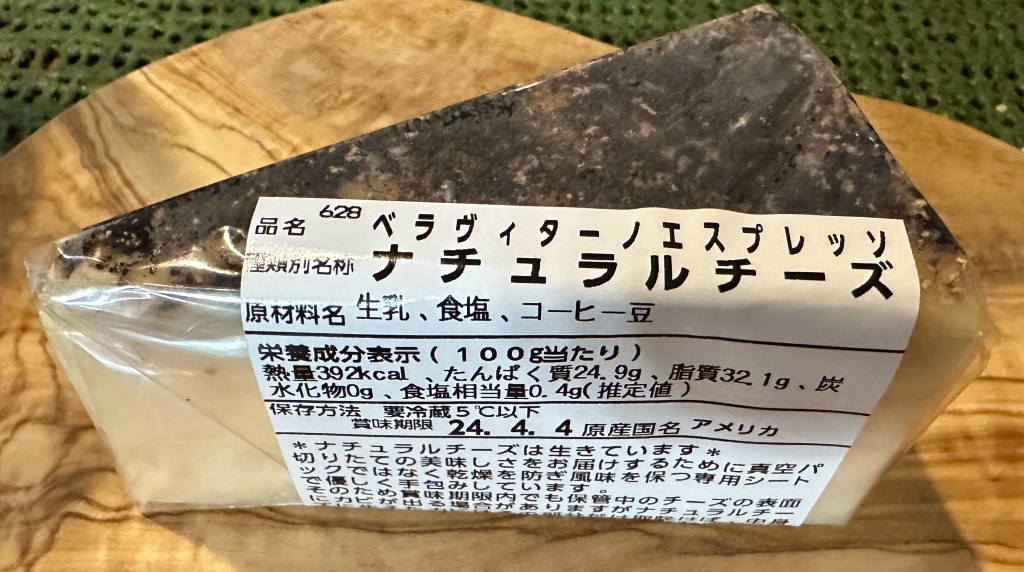 ベラヴィーターノエスプレッソというアメリカのアルチザンチーズです。表面がコーヒー豆で覆われておりコーヒーの深い香りと旨味が、赤ワインと好相性です。